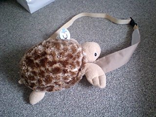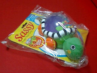 takehirox用にと親戚から頂いた sassyのカメのおもちゃです。 まだ開けてないけど、どうやら 足がタイヤになっていて、ころがすと 甲羅の中のボールがポンポン跳ねるらしい。 最高ですね。