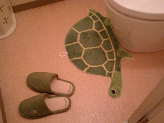 カメのトイレマットです。 踏んでしまうことに罪悪感を抱きますが、 しかたが無いですね。 ちなみにトイレットペーパーのカバーも カメです。 どんなときでもカメと一緒です。